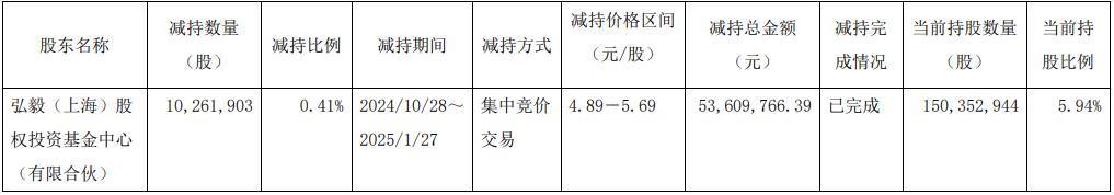 2025年2月6日,公司于2025年1月27日收盘后收到公司激动弘毅(上海)股权投资基金中心(有限搭伙)发来的《减抓公司股份表现文牍函》,弘毅(上海)股权投资基金中心(有限搭伙)自2024年10月28日至2025年1月27日通过聚拢竞价交游面孔减抓公司股份10,261,903股,占公司总股本的比例0.41%。浪漫该公告走漏日,该次减抓盘算走漏的减抓时辰区间届满,减抓盘算收尾。