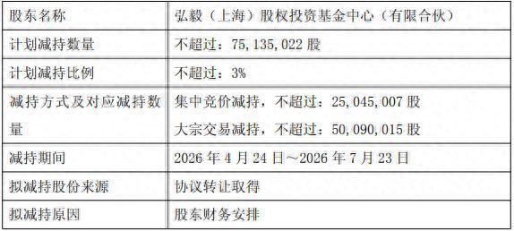 弘毅(上海)股权投资基金中心(有限搭伙)盘算自本公告走漏之日起15个交游日后的3个月内,通过聚拢竞价交游、巨额交游等面孔,减抓其抓有的公司股份不跨越75,135,022股,减抓比例不跨越公司股份总额的3%。