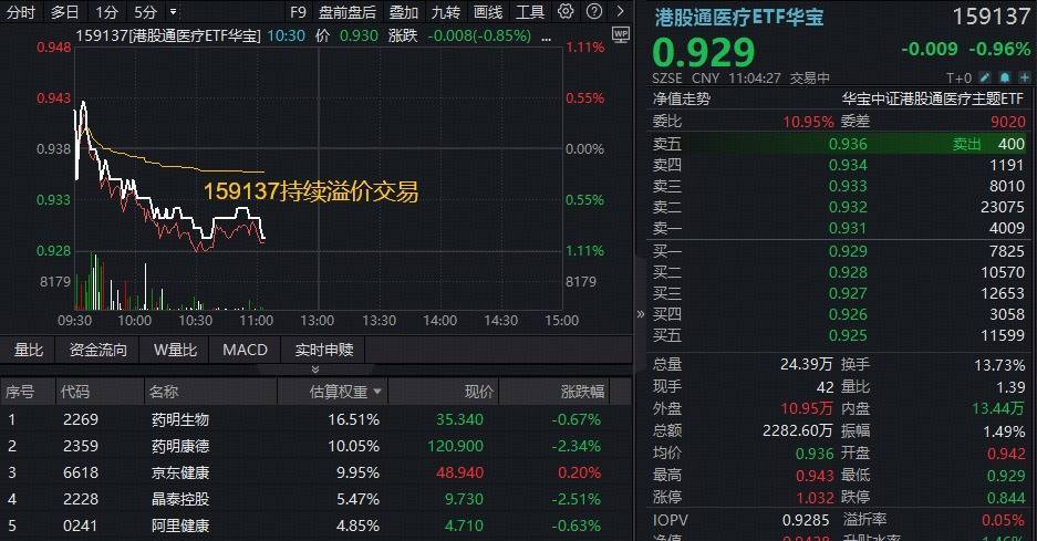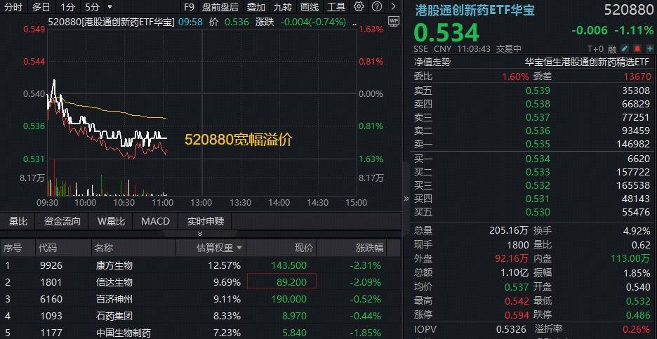4月21日早盘,港股医药钞票全线调理,100%改换药研发方针——港股通改换药ETF华宝(520880)、港股医疗核心钞票——港股通医疗ETF华宝(159137)双双跌逾1%,不外场内均呈现宽幅溢价,暴露买盘资金活跃。